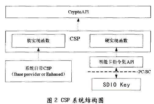 從圖1可以看出,它分為應(yīng)用層:系統(tǒng)層和加密服務(wù)提供層。處于應(yīng)用層的應(yīng)用程序通過(guò)Crypto API來(lái)調(diào)用CSP模塊提供的各種服務(wù)。 3 軟硬件結(jié)合的CSP開(kāi)發(fā)